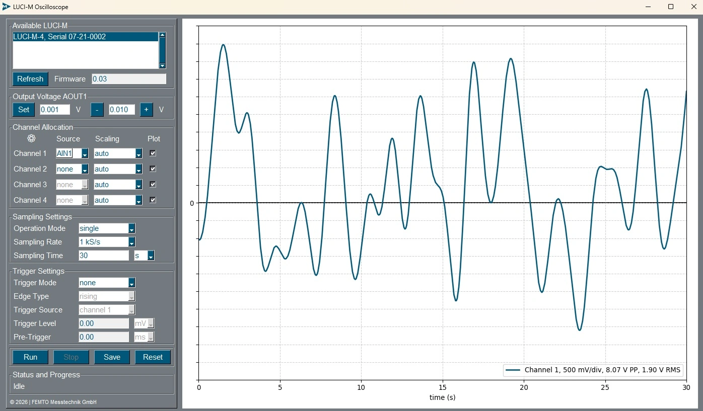 Das LUCI-M ist ein universelles Datenerfassungs und Steuersystem. Es wird per USB angeschlossen und bietet modellabhängig zwei oder vier frei zuweisbare Analog-Digital-Wandler (ADC) zur Erfassung und Digitalisierung von Messwerten. Es stehen ebenso drei Digital-Analog-Wandler (DAC) zur Verfügung, zum Steuern externer Geräte oder als Quelle für Bias- und Offset-Spannungen. Weitere insgesamt 24 digitale I/Os dienen zum Einlesen von Status- oder Alarmmeldungen und zum Schalten weiterer Peripherie.
